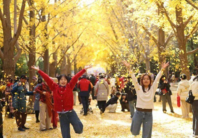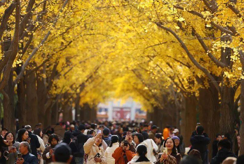 地坛公园的银杏大道早已是热门打卡地,赏叶的游客络绎不绝。
