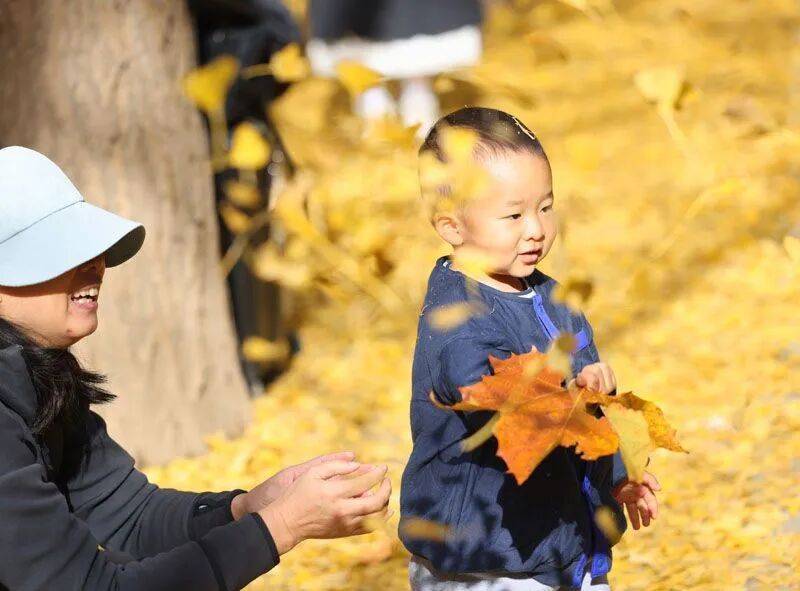 游客扬起手中金黄的落叶,定格秋日限定美景。